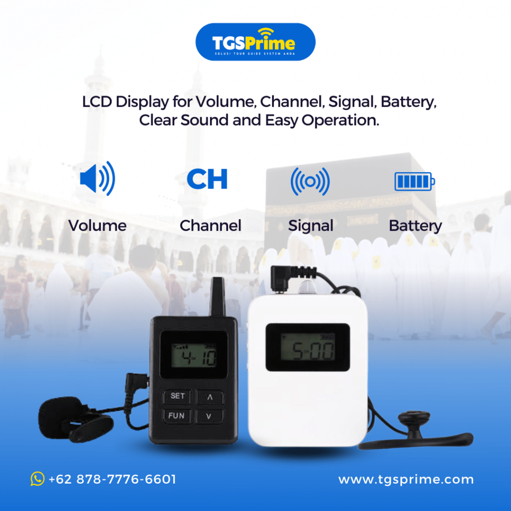 TGSPrime hadir sejak 2013 membantu banyak Travel Haji & Umroh di Indonesia, untuk kebutuhan Jemaah ketika sedang beribadah ditanah suci, Alat Audio Wireless Tour Guide System merupakan Seperangkat alat portable mini yang memudahkan Muthawif memandu para Jemaah Umroh dan Haji, tanpa perlu lagi Muthawif berteriak lantang agar didengar oleh para Jemaah, meskipun Jemaah sedang berada di tempat yang jauh dan sangat bising sekalipun. Alat Audio Wireless Tour Guide System ini sangat membantu aktifitas para Jemaah saat menunaikan ibadah Umrah & Haji, sehingga Ibadah yang dilaksanakan akan terasa lebih Khusyu’.
